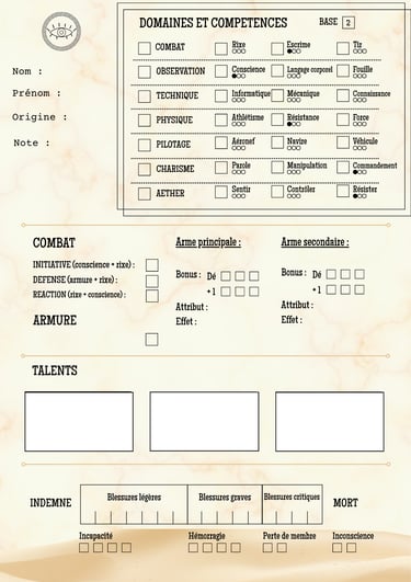 Les Domaines : ce sont vos grandes aptitudes (Combat, Observation, Technique, Pilotage, Charisme, Aether).